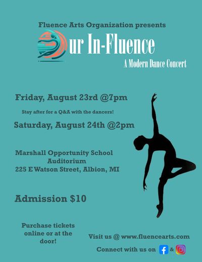 Fluence Arts Organization is a newly established 501c3 nonprofit organization based out of Albion, MI. Artistic Director, Kristy Clement, established the organization in order to expose the community to the art of dance, provide opportunities for up-and-coming dancers and choreographers to showcase their craft and talents, and to continue her mentor, Missy Wyss’s legacy of making dance happen as much as possible!